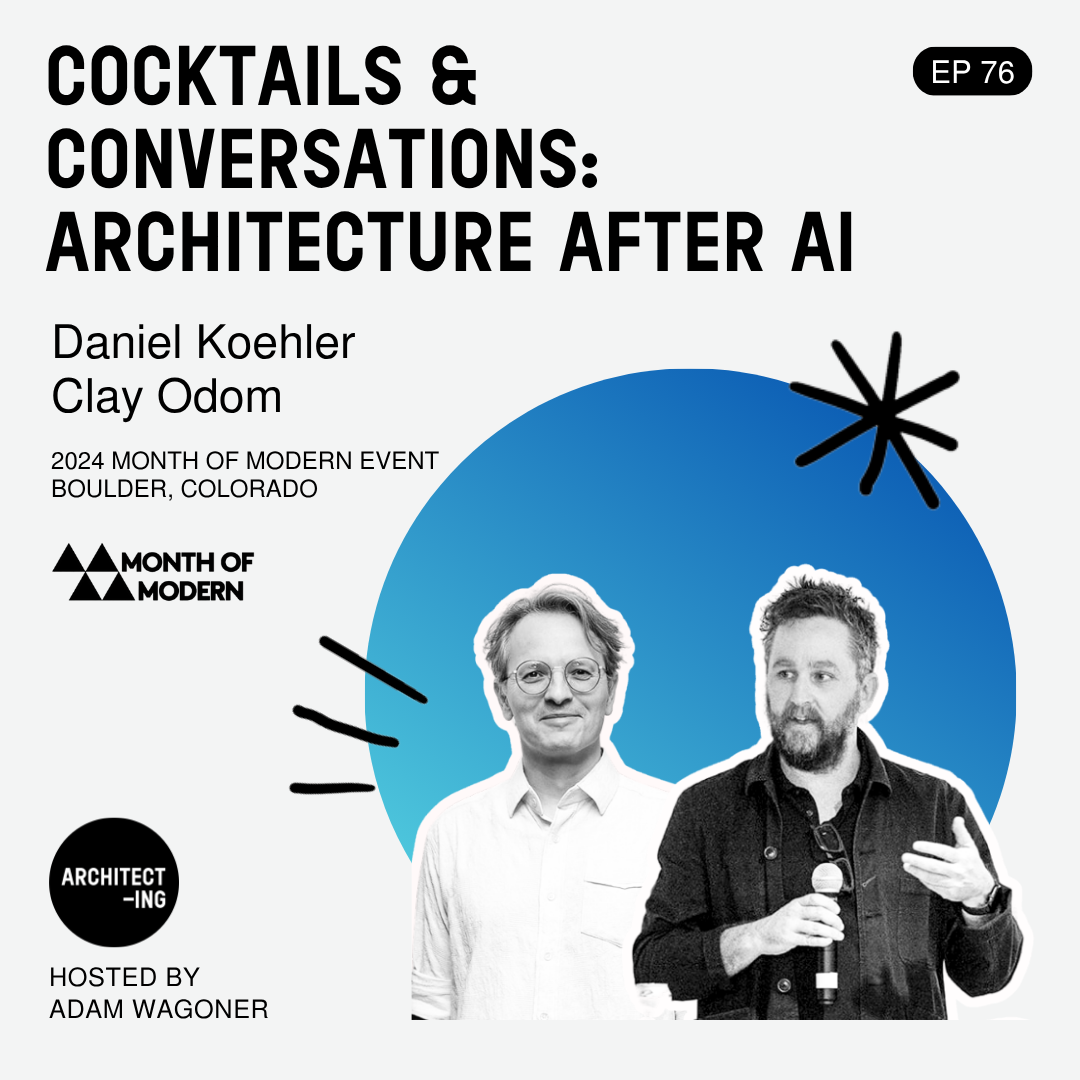 In collaboration with Month of Modern, Daniel Koehler and Clay Odom, professors from the University of Texas join host Adam Wagoner on the show to discuss the transformative impact of AI on architecture. Recorded live in downtown Boulder, this event featured a panel discussion with an audience of architects and enthusiasts to explore how AI is redefining the traditional architecture industry through innovative technologies and new design possibilities. Daniel and Clay recently collaborated on a major exhibition that explores the impact of artificial intelligence on architectural design. The conversation centers around the integration of AI in architectural education, the democratization of design tools, and the implications of AI on construction processes.